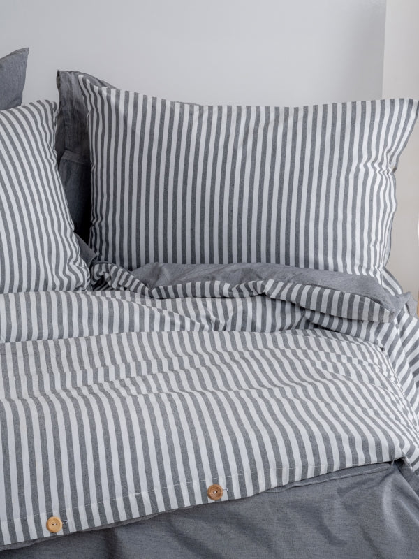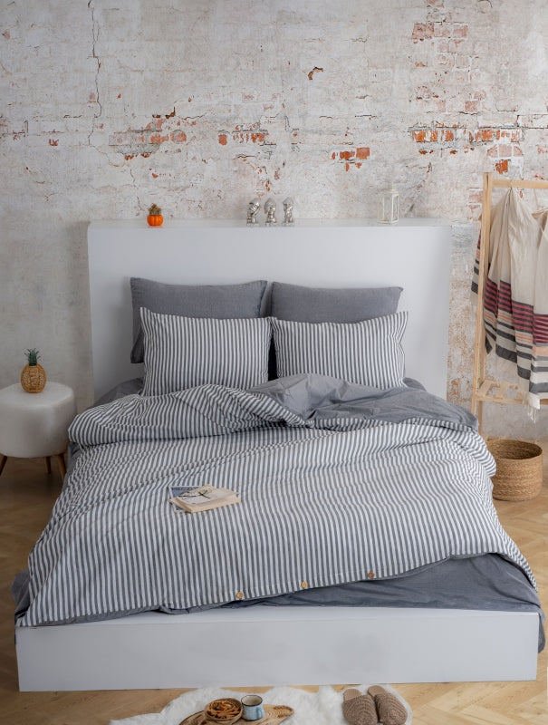 - Yatak odanızda şıklığı ve konforu bir arada sunan antrasit çizgili çift kişilik pamuklu nevresim takımı.